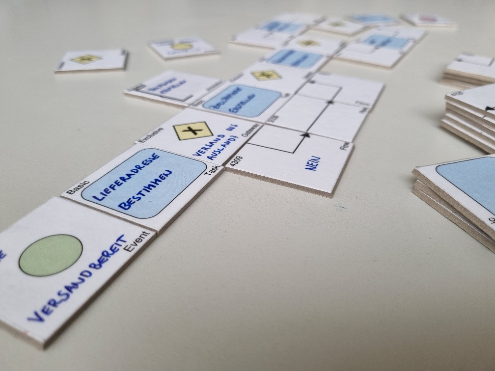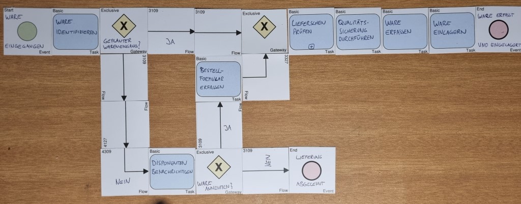 Wurde der (Teil-)Prozess mit den vereinfachten BPMN-Karten (was ist BPMN?) fertig modelliert, wird ein Foto davon gemacht.